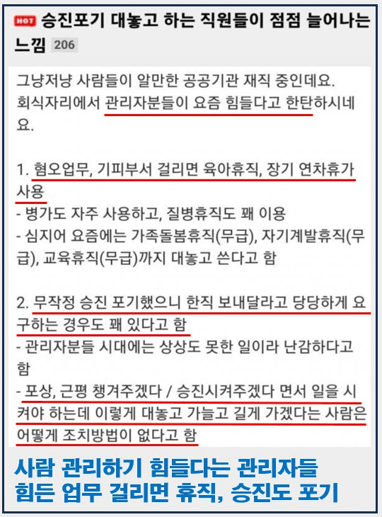 최근, 한 커뮤니티에서 요즘 직장인들이 대놓고 승진을 포기하여, 관리자들이 어려움을 겪고 있다는 글이 ...