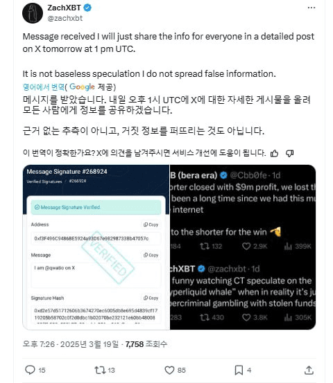 쟈크비트 장안의 이슈인 하리고래 정체 밝히겠다. 출처 메시지를 받았습니다. 내일 오후 1시 UTC에 X에 대한 자세한 게시물을 올려 모든 사람에게 정보를 공유하겠습니다. 근거 없는 추측이 아니고, 거짓 정보를 퍼뜨리는 것도 아닙니다. 이전에 올린 글로 보았을때, 도난된 자금으로 사이버 범죄를 행하는 사람이라고 언급한 적은 있음.