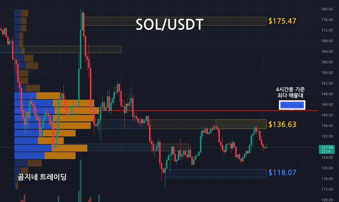 솔라나 주요 지지, 저항대 확인 (4시간봉-1일1회 업데이트) 1️⃣ Key Level 저항선1 : 노란영역, $175.47 저항선2 : 노란영역, $136.63 지지선1 : 파란영역, $118.07 2️⃣ 최다 거래량 발생 기준 02/24 이후 4시간봉 기준 최다 매물대 지지선 : $141.68