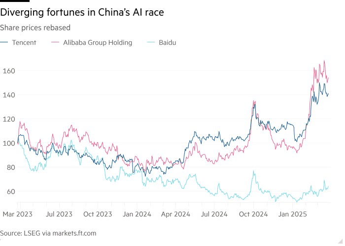 @신문읽어주는언니: FT 헤드라인: China’s AI race creates tension at home -중국의 인공지능(AI) 개발 속도가 급격히 가속화되며, 최근의 기술 혁신이 새로운 기준을 세우고 있음. #딥시크 (DeepSeek)는 업그레이드된 V3 모델을 공개했고, 알리바바는 모바일 기기에서도 작동 가능한 새로운 ' #취안 (Qwen)'... $BABA $BIDU $HANARO글로벌생성형AI액티브 $TIMEFOLIO글로벌AI인공지능액티브 $TME $UNICORN생성형AI강소기업액티브 #AI #딥시크 #인공지능 #중국AI #취안 #텐센트