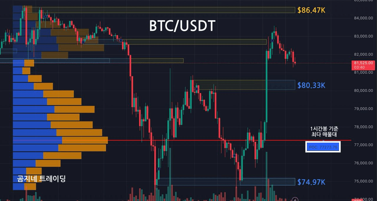비트코인 주요 지지, 저항대 확인 (1시간봉-1일2회 업데이트) 1️⃣ Key Level 저항선1 : 노란영역, $84.47K 지지선1 : 파란영역, $80.33K 지지선2 : 파란영역, $74.97K 2️⃣ 최다 거래량 발생 기준 04/04 이후 1시간봉 기준 최다 매물대 지지선 : $77.27K