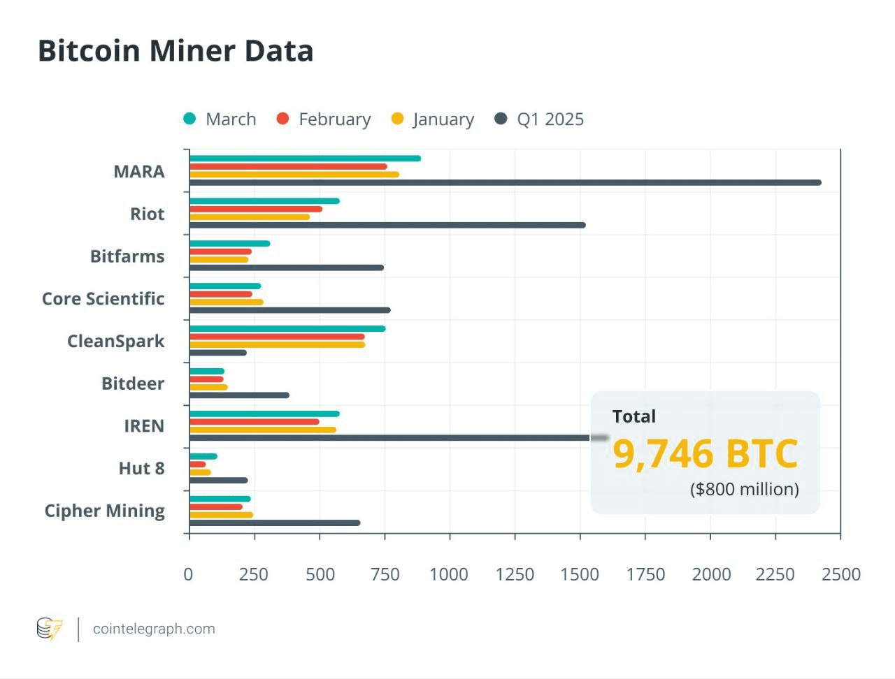상위 비트코인 채굴자들은 2025년 1분기에 약 8억 달러 상당의 BTC를 생산했습니다.