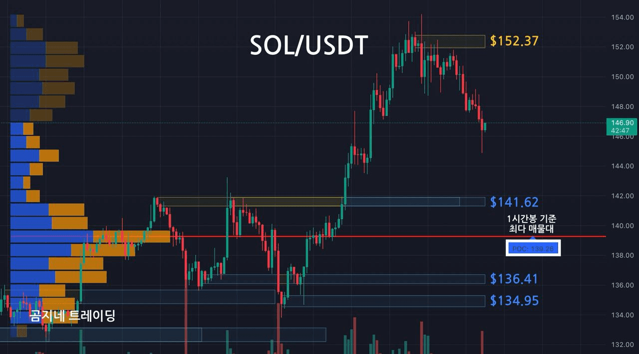 솔라나 주요 지지, 저항대 확인 (1시간봉-1일2회 업데이트) 1️⃣ Key Level 저항선1 : 노란영역, $152.37 지지선1 : 파란영역, $141.62 지지선2 : 파란영역, $136.41 지지선3 : 파란영역, $134.95 2️⃣ 최다 거래량 발생 기준 04/18 이후 1시간봉 기준 최다 매물대 지지선 : $139.26