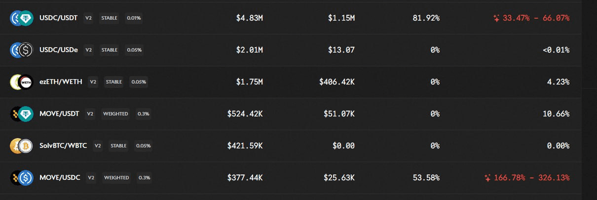 한김 식히고 난 후의 무동강물 후기 어제 이율은 TVL이 워낙 낮아 거품이 낀것 같고, 이제 본격적으로 옮긴 사람 다 옮긴 상태에서 보면 준수하다 정도일듯?! 무브먼트 디앱에 대해 잘 모르기 때문에 이전부터 이곳저곳 뿌리 잘 내리는 Echelon 위주로 보면 풍차 돌렸을 시에 괜찮게 나오는 것 같음. 매매보다 스테이블 코인 굴리기 위주에 관심있으신 분들은 할만한 것 같습니다. 무브먼트도 무동강물을 스테이블 페어 위주로만 뿌리고 있네요.