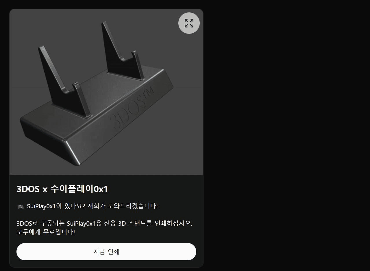 옛날에 3D프린트 관련해서 쓰레드 적어봤을 때 살짝 언급했던 탈중앙화 3D프린트 프로젝트 3DOS. 여기서 수이플레이용 스탠드 무료로 출력할 수 있게 3D 프린트 도면을 제공했네요 호호 몰랐는데 이거 레퍼럴 프로그램도 있구나. https://dashboard.3dos.io/register?ref_code=cefb11 숙달된 조교들은 뒤의 레퍼럴 코드 떼고 (뭐 얻을것도 없음) 접속해서 구경하면 됨. 포인트는 3D프린트 도면 사거나, 출력할 때 이용가능한듯