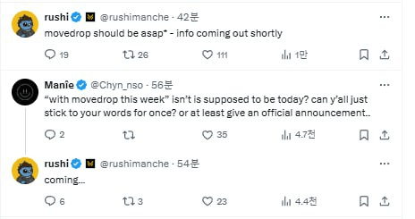 무브먼트 $MOVE$MOVE 드랍 이번주에 한다. 출처 상장때 클레임 안하고 메인넷 선택한 사람 오열중.