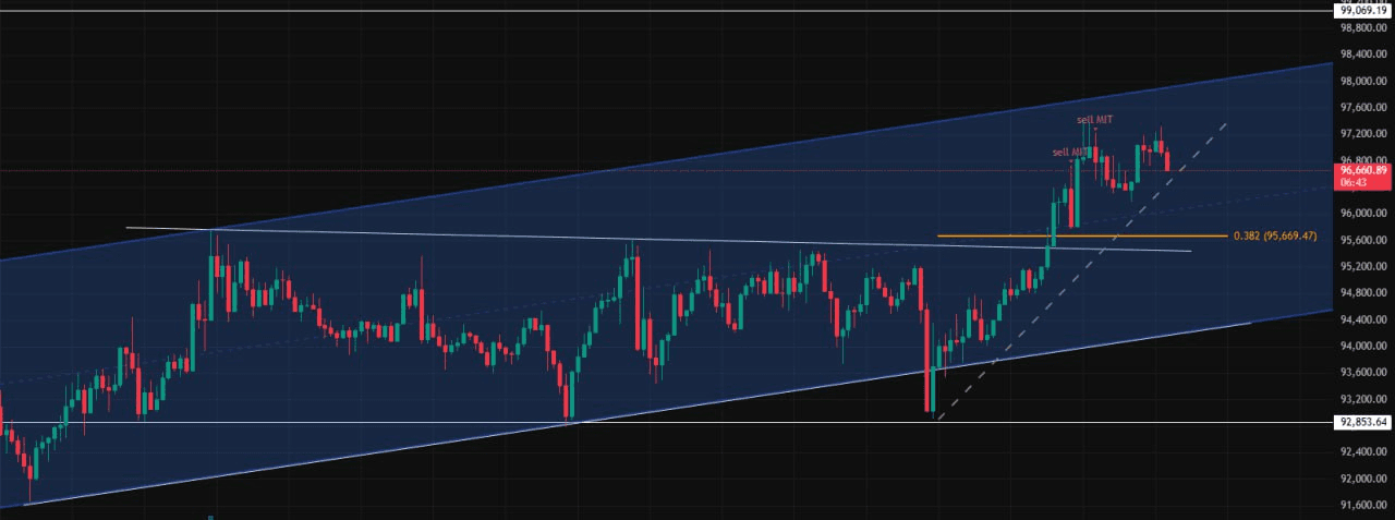 관점 업데이트 비중 30% 정도 손절하고 남은 물량은 아직 홀딩 중 95.6k~95.4k 정도까진 조정 기대 중 (0.382 되돌림, 추세 빗각 리테스트)