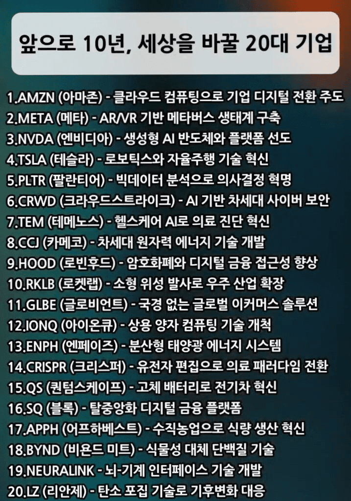 @예언자: 세상을 바꿀 기업 20선 $AMZN $META $NVDA $TSLA $PLTR $CRWD $TEM $CCJ $HOOD $RKLB $GLBE $IONQ $ENPH $CRSP $QS $SQ $APPH $BYND $LZ #뉴럴링크 #혁신 #혁신기업