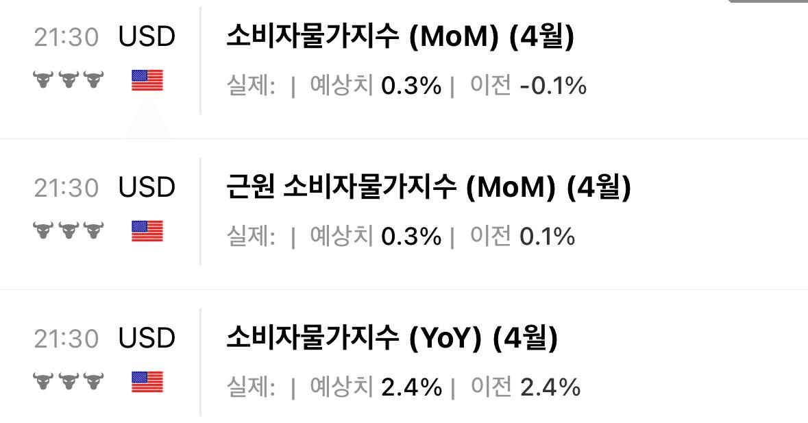 금일 21:30 미국 소비자물가지수(CPI)가 발표될 예정입니다. 일정 참고하시어 변동성 주의하시길 바랍니다.