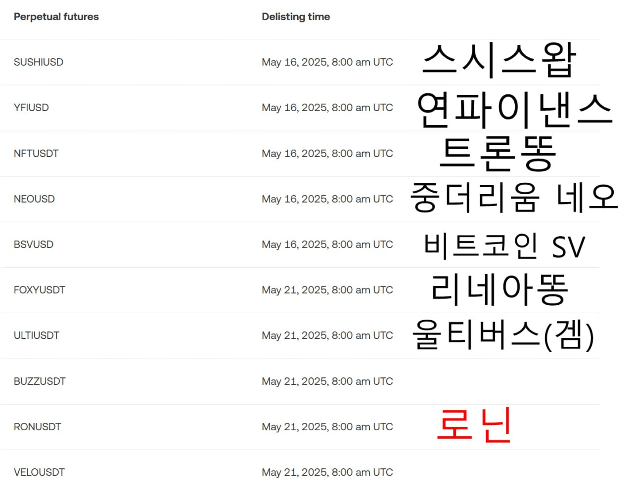 OKX 상폐되는 리스트인데 딴건 다 그렇다치고 로닌은 왜 상폐지요... 네오 연파 스시도 상폐될 급은 아닌데 뭐지요...