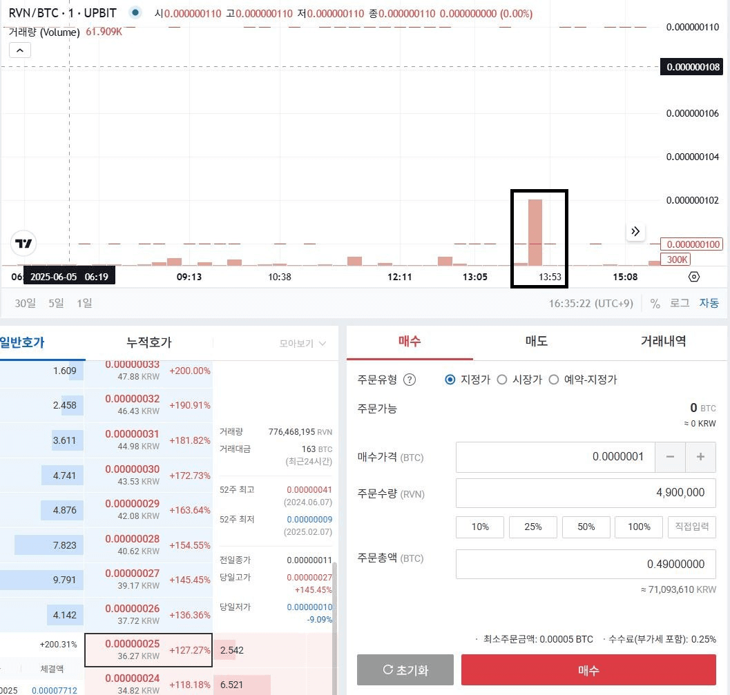 ✅ $RVN BTC 마켓에서 13:51분에 약 0.5비트 정도의 거래량이 떠 있습니다. 이 정도 거래량이면 $RVN의 거의 하루 치 거래량인데, 갑자기 왜일까요?