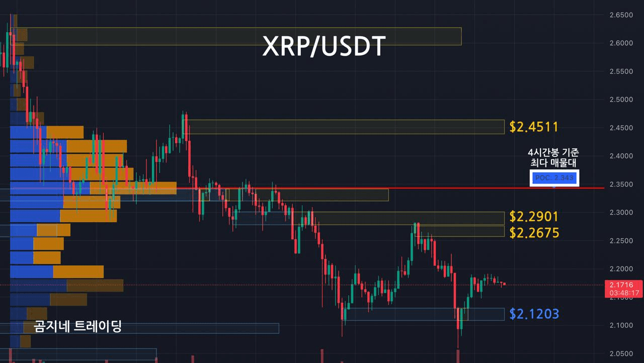 리플 주요 지지, 저항대 확인 (4시간봉-1일1회 업데이트) 1️⃣ Key Level 저항선1 : 노란영역, $2.4511 저항선2 : 노란영역, $2.2901 저항선3 : 노란영역, $2.2675 지지선1 : 파란영역, $2.1203 2️⃣ 최다 거래량 발생 기준 05/14 이후 4시간봉 기준 최다 매물대 지지선 : $2.3430