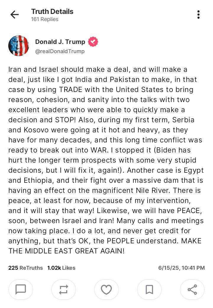 이란과 이스라엘은 거래를 해야 하며, 결국 거래를 하게 될 것입니다. 인도와 파키스탄 간의 거래를 성사시켰던 것처럼 말입니다. 그때는 미국과의 무역을 활용해 양측 지도자들이 이성, 결속, 그리고 건전한 판단을 바탕으로 신속히 결정을 내릴 수 있도록 이끌었습니다. 두 지도자 모두 훌륭했고, 그 결과 전면 충돌을 멈출 수 있었습니다!