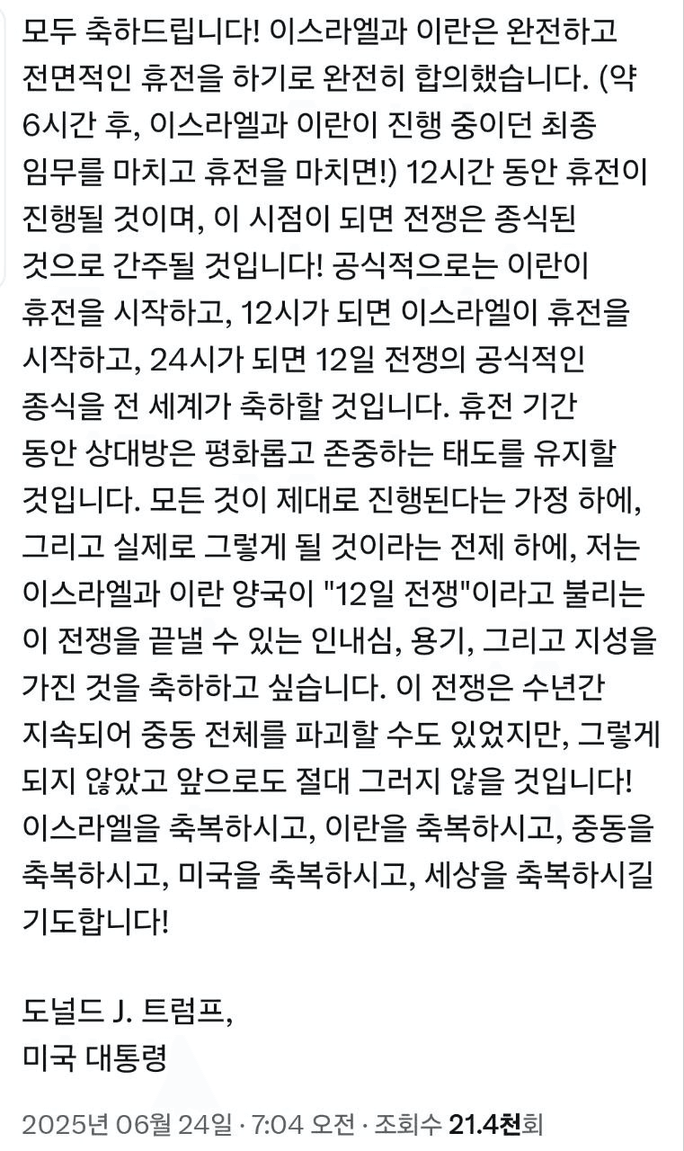 트황 휴전 선언 https://x.com/trump_repost/status/1937270682381173050?s=19