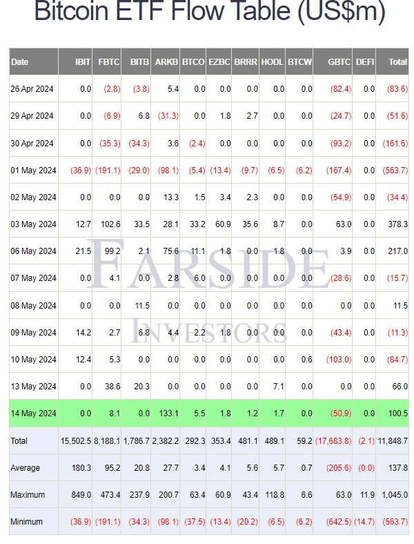 15일 파사이드 인베스터에 따르면, 14일(어제) 미 비트코인 현물 ETF 1억 50만 달러 순유입은 1억 50만 달러를 기록했다.